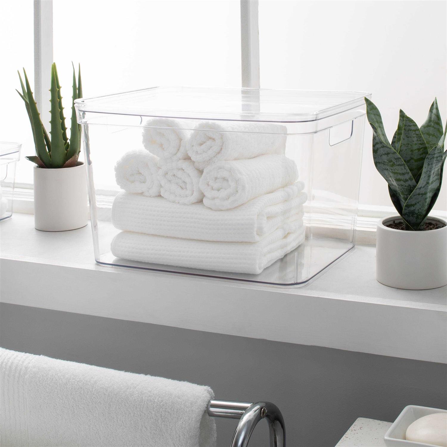 Keep your space organized with the Simplify Large Lidded Storage Bin. It is the perfect size for desk accessories such as notebooks. It is also good for holding towels and washcloths, and it is the perfect size for holding stuffed animals. The stackable design makes it convenient to store items in a sufficient space saving way. The lid protects items from dust and odors and open handles makes the box easy to transport. The clear design makes items inside visible and easy to find. You can keep this transparent storage bin on your desktop or countertop surface because it fits with any room’s décor. You need this bin to help you organize your home!