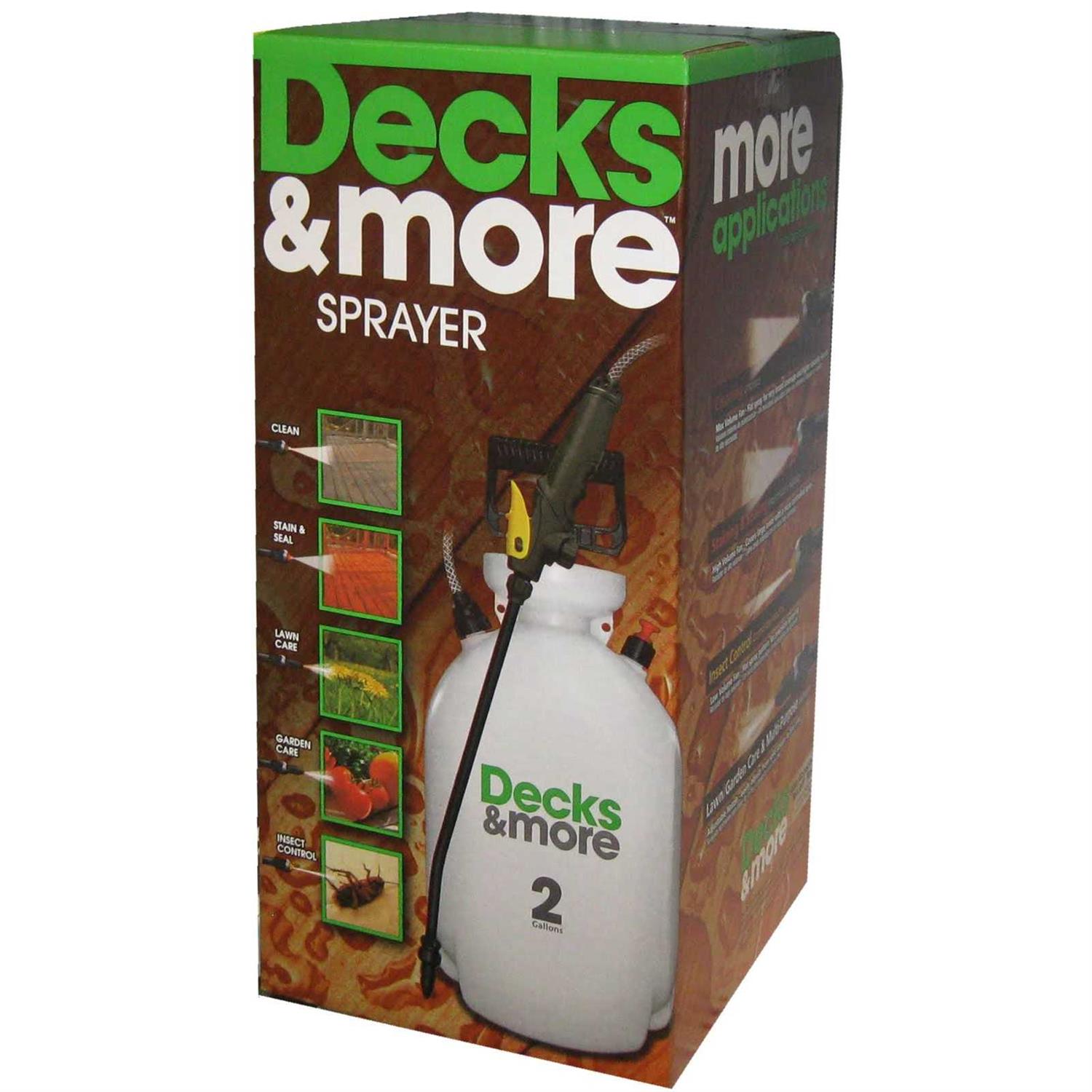 The decks and more 190377 universal sprayer is the only pump sprayer you will need around your home. It can be used to seal concrete, kill weeds, feed plants, control insects, detail your car, clean windows, control dust, bleach, degrease, clean shingles, water plants and more. Note: not designed for applying stains. The lockable shut-off reduces hand fatigue while continuously spraying chemicals. Viton seals are throughout the pump and shut-off offering the best chemical resistance to bleach and other harsh chemicals. The heart and soul of this sprayer is the highly efficient pump. It requires 25% fewer pumps per gallon than the leading competitor.