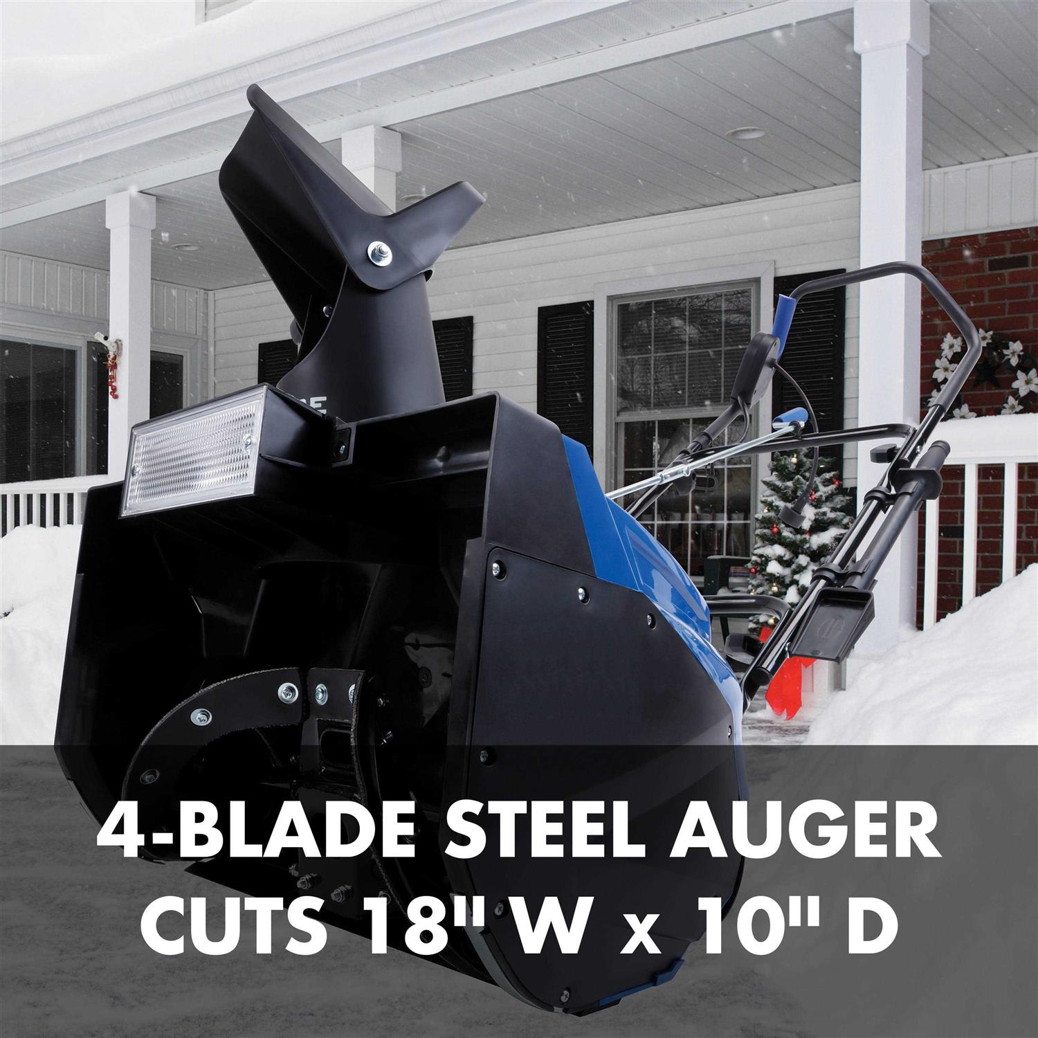 Ideal for clearing snow off mid to large sized driveways and walkways. No gas, oil or tune-ups make it effortless to start and maintain. Powerful 15 amp motor moves up to 720 lbs of snow per minute. 4-blade steel auger cuts 18″ wide by 10″ deep with each pass. 180 degree adjustable directional chute throws snow up to 25′ away in the direction you want it to go. 20 W halogen light to clear paths day or night. Universal chute clean-out tool included to help remove show build-up. Easy-glide wheels make the Snow Joe Ultra super easy to turn and maneuver. The scraper blade at the base of the unit efficiently scrapes the snow clear to the ground without damaging your deck or pavement. Compact wheels for easy maneuverability. ETL approved.