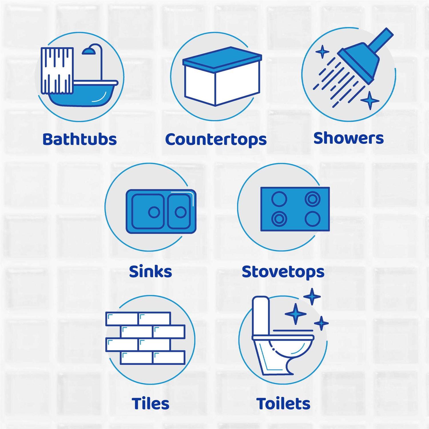 • Use on bathtubs, countertops, showers, sinks, stovetops, tiles, and toilets