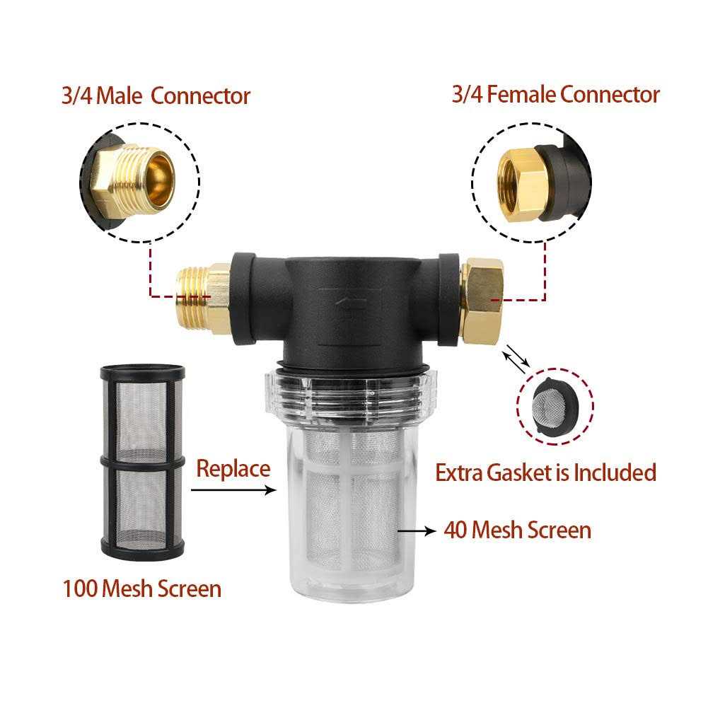 Accessories by Sooprinse. Details: The professional service team is always here for you. Specification: – Maximum 80 Psi Garden hose pressure – For Garden hose or pressure washer use – Maximum temperature: 140°F – 3/4 inch Male inlet, 3/4 inch Female outlet. Package Includes: – 1 x inline hose filter (40 mesh screen) – 2 x 100 mesh screen – 3 x O-Ring – 4 x filter hose washers Application: – As a high pressure cleaner water filter, it can protect high pressure cleaner components, such as high pressure cleaner pump, water broom, high pressure cleaner hose, pressure washer spray gun. – As a garden hose filter, it can protect the parts of the high pressure cleaner from being blocked or damaged by sand and debris. Warning: Sediment filters must be used with household faucets or water pressure inlets to filter sediments or debris from the water supply.