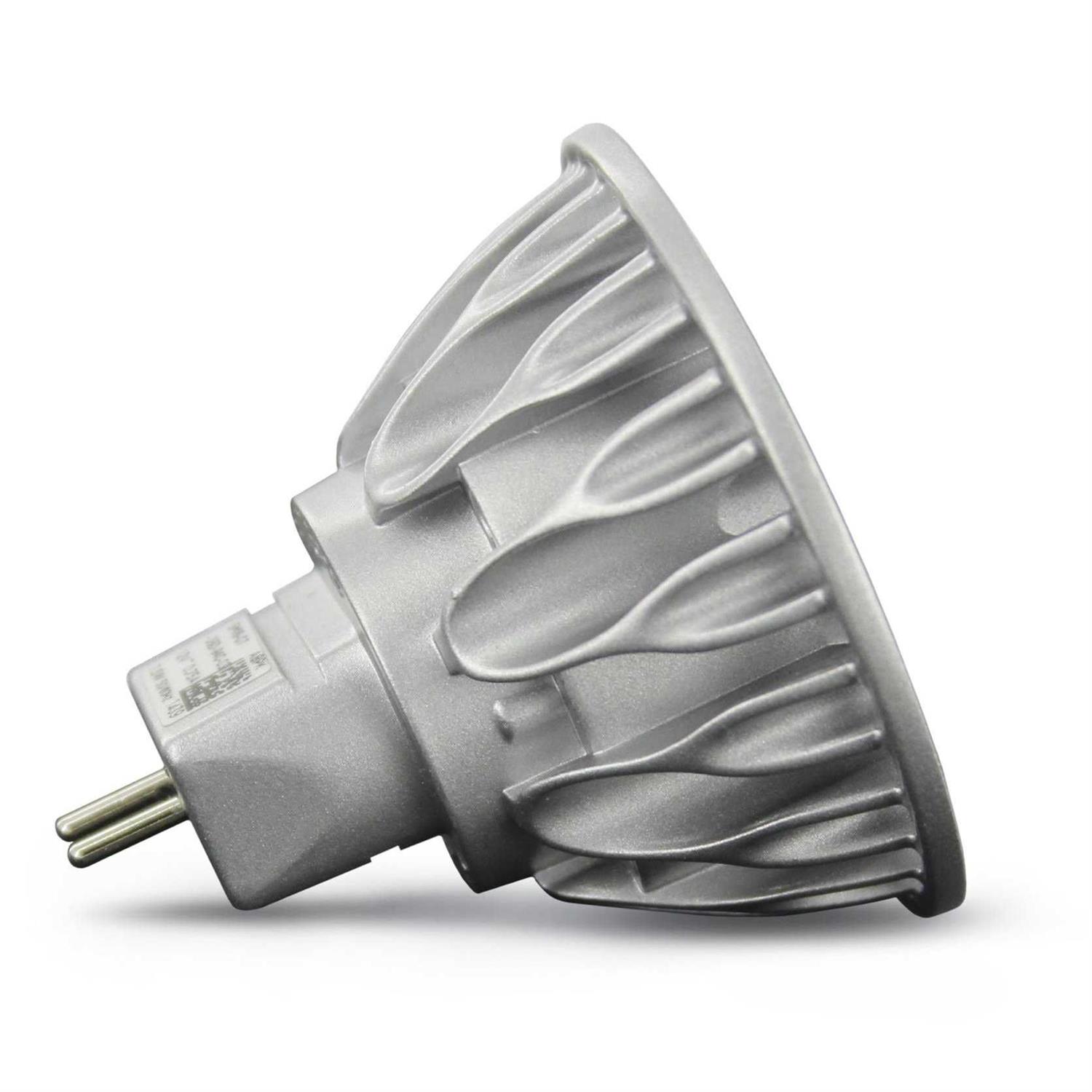 A 9W rated single-source COB lamp that will emit 690 lumen of 2700K very warm white coloured light. Offers a 36 degree beam angle. 85% more energy efficient than standard halogen lamps. Suitable for use with MR16 compatible recessed downlights track lighting and other indoor and outdoor applications. Part of the Soraa Brilliant range the lamp benefits from 90 CRI colour and natural white technology that emits appropriate wave lengths of each coloured light. Product Dimensions Height 45.5mm x Width 50.1mm. Please note LED MR16 lamps require drivers of the appropriate voltage to operate and have limited compatibility with existing halogen transformers. The lumens for this product varies depending on distance and the beam angle of the lamp.