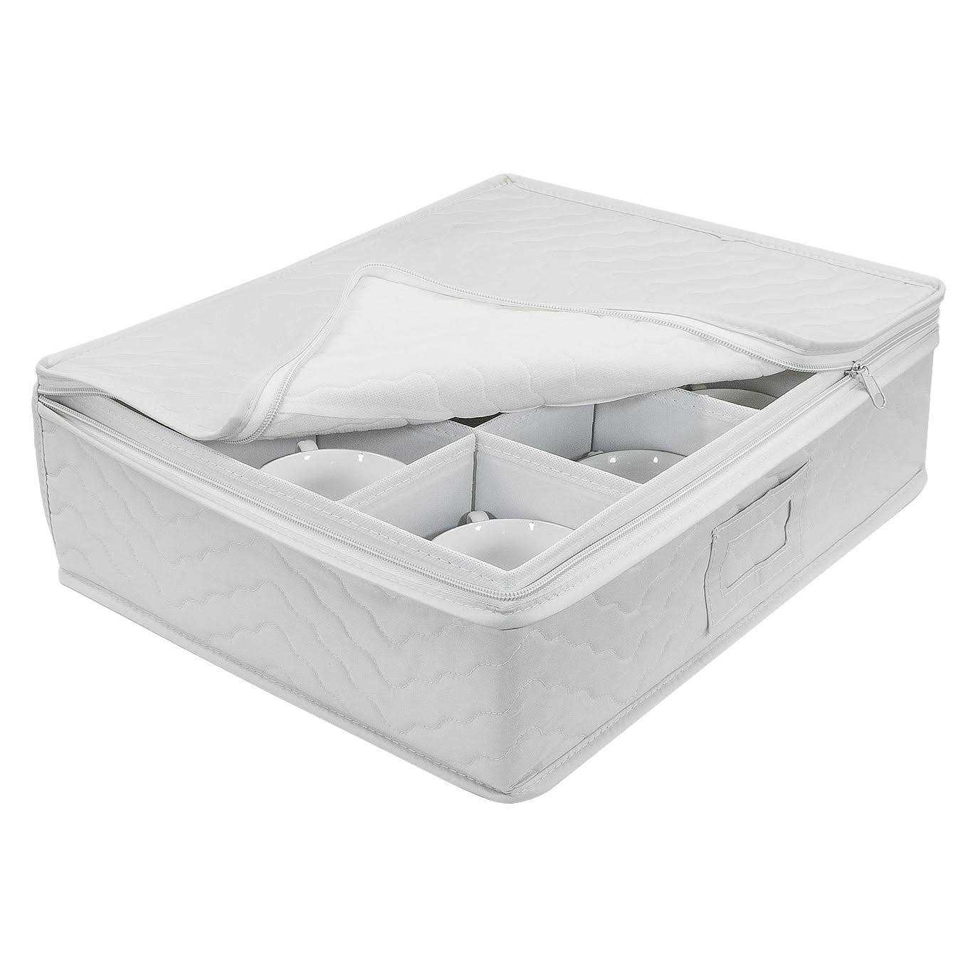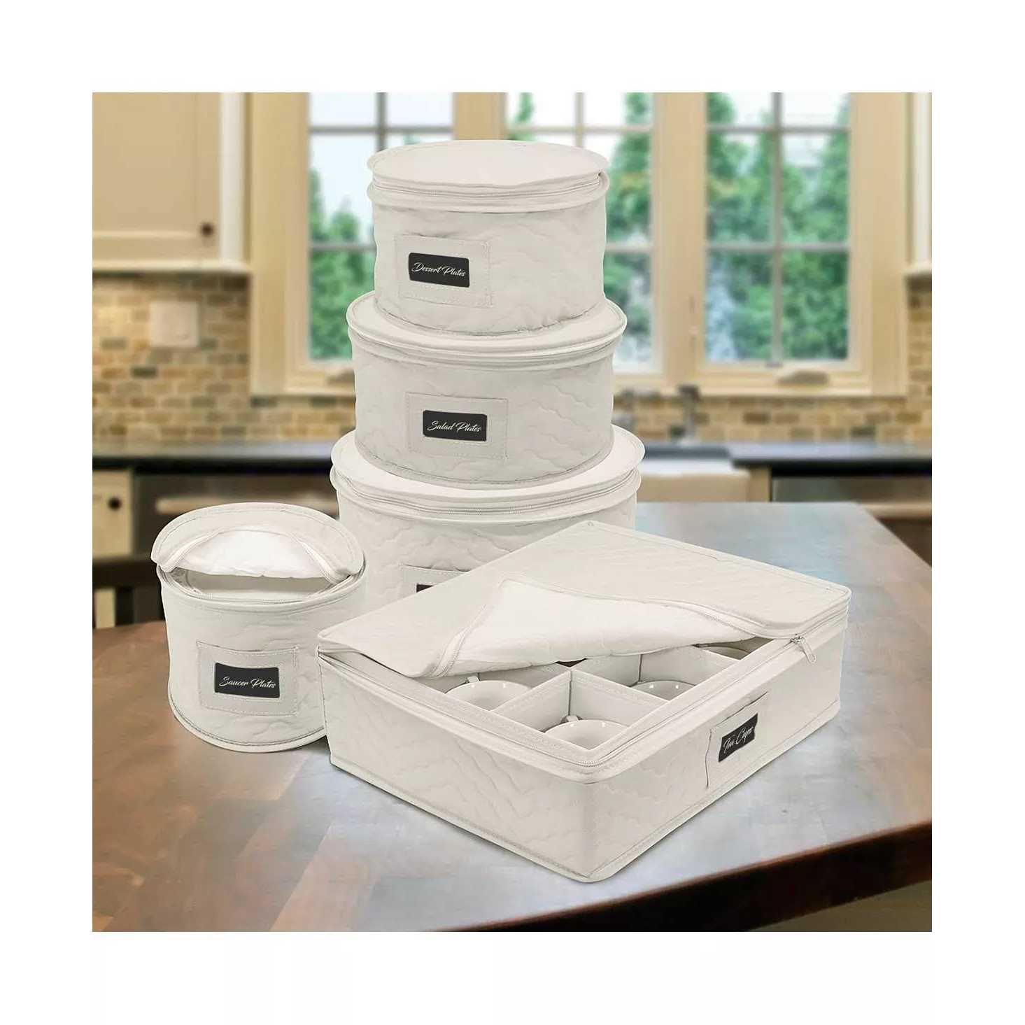 Providing service for 12, this quilted set is designed to hold dinner plates, salad plates, dessert plates, saucer plates, and cups. A top loading design allows for easy access and the gentle nylon zippers keep your cases sealed and protected from dust. It features padded felt protectors to cushion plates and cardboard dividers to protect glassware and mugs from damage. With proper placement, cases can be stored in hutches, cabinets, pantry closets, or the buffet. For added convenience, add a chic label using the content label insert to quickly identify dishes for your next dinner party or afternoon tea. Keep your dishes in mint condition and ready to shine for special occasions. No more time-consuming searches for your prized tableware! This set is allows you to arrange your place settings with ease whether the meal is casual or formal. When the meal is over and you’re ready to hang up your hostess apron, return your dishes to its safe home in storage. For china sets that only come out during special occasions or holidays, such as Thanksgiving or Christmas, consider storing all your pieces with durable quilted protection instead of old boxes and newspaper. It’s ideal for precious china, expensive dinnerware, or priceless inherited heirlooms from generations before. Dishes can be switched out as seasons or decorating tastes change throughout the year. This special piece is destined to make a great housewarming, hostess, or bridal gift!