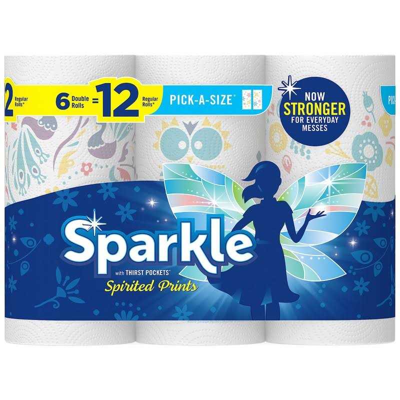 Paper Towels by SPARKLE. Details:Sparkle Pick-A-Size Spirited Prints Paper Towels with Thirst Pockets are designed with a perforation in each sheet so you can pick between a full size or half size sheet for your everyday tasks. Each Double Roll contains 110 2-ply sheets. Sparkle Paper Towels with Spirited Prints designs include stylish designs that can brighten up your home and are just right for cleaning up your everyday messes without cleaning out your piggy bank.