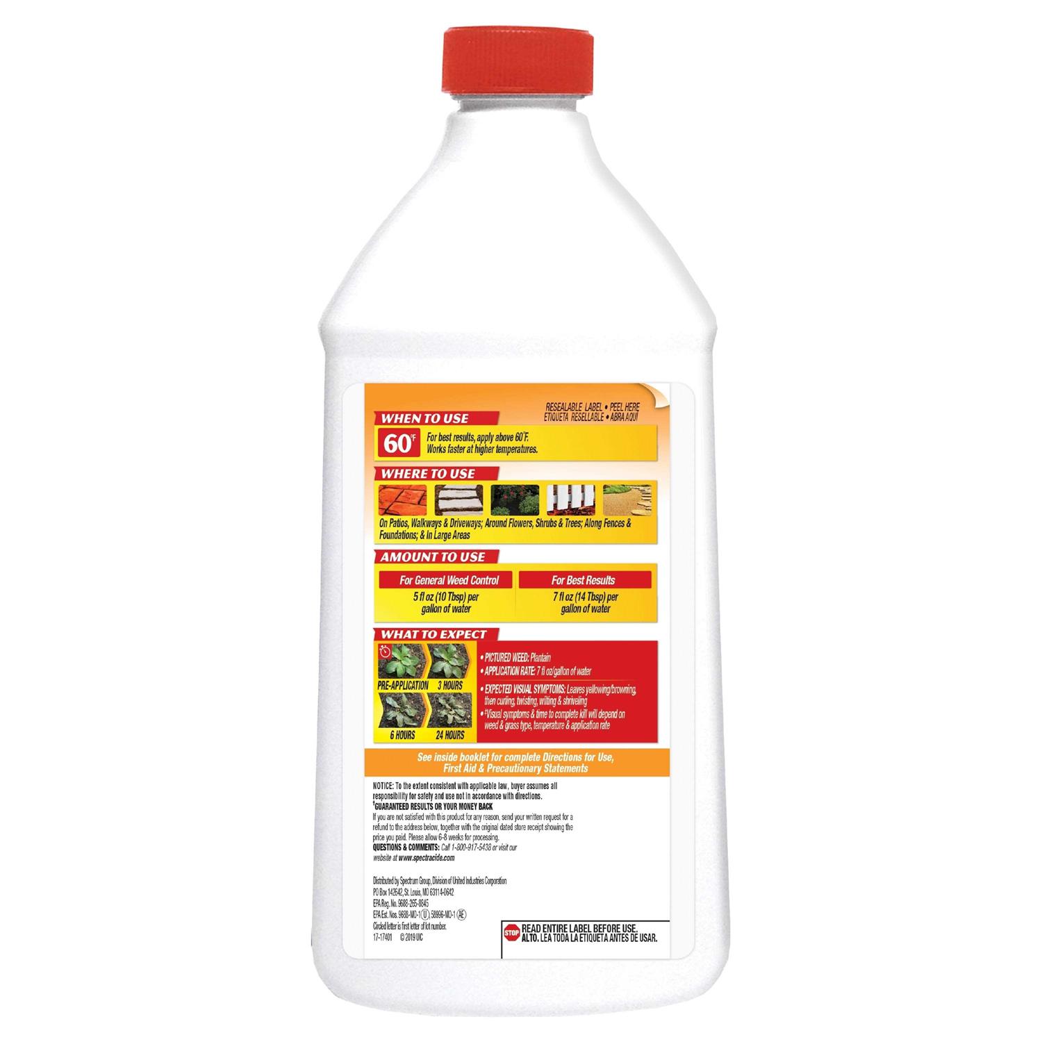 Spectracide Weed & Grass Killer Concentrate is a nonselective weed and grass killer that kills weeds and grasses down to the root. Its formulated for spot treatment of weeds and grasses on patios, walkways and driveways; around flowers, shrubs and trees; and along fences and foundations. This formula is rainproof in 15 minutes rainfall or watering after 15 minutes wont wash away effectiveness. Spectracide Weed & Grass Killer Concentrate delivers visible results in as fast as 3 hours. Plant new flowers, trees and shrubs in the treated area after just 1 day. For best results, apply during warm, sunny weather when the temperature is over 60 degrees. Mix with water and apply with a tank sprayer at the rates directed on the product label. Completely cover the leaves of the target vegetation. Protect desirable plants with a piece of plastic or cardboard if desirable plants are accidentally sprayed, wash with water immediately. Do not mow, cut or otherwise disturb treated vegetation for at least 7 days following application. Do not use on or around edible feed or food crops.