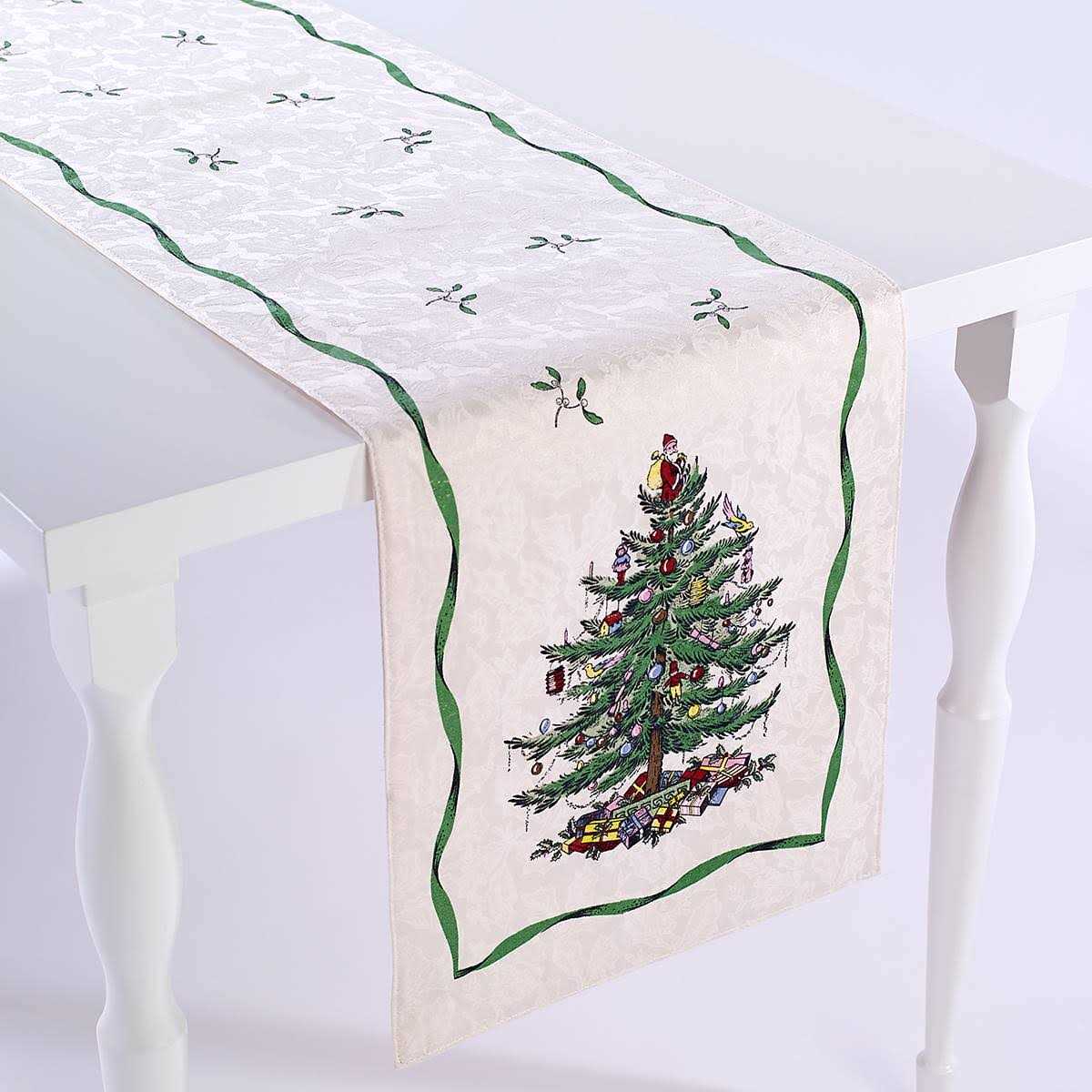 The new Spode Christmas Tree 108 Runner by Avanti features the iconic Christmas tree design with tossed holly leaves and a green ribbon border. Printed on a 58% cotton/42% polyester jacquard woven cloth. Measures 108 x 14 inches.