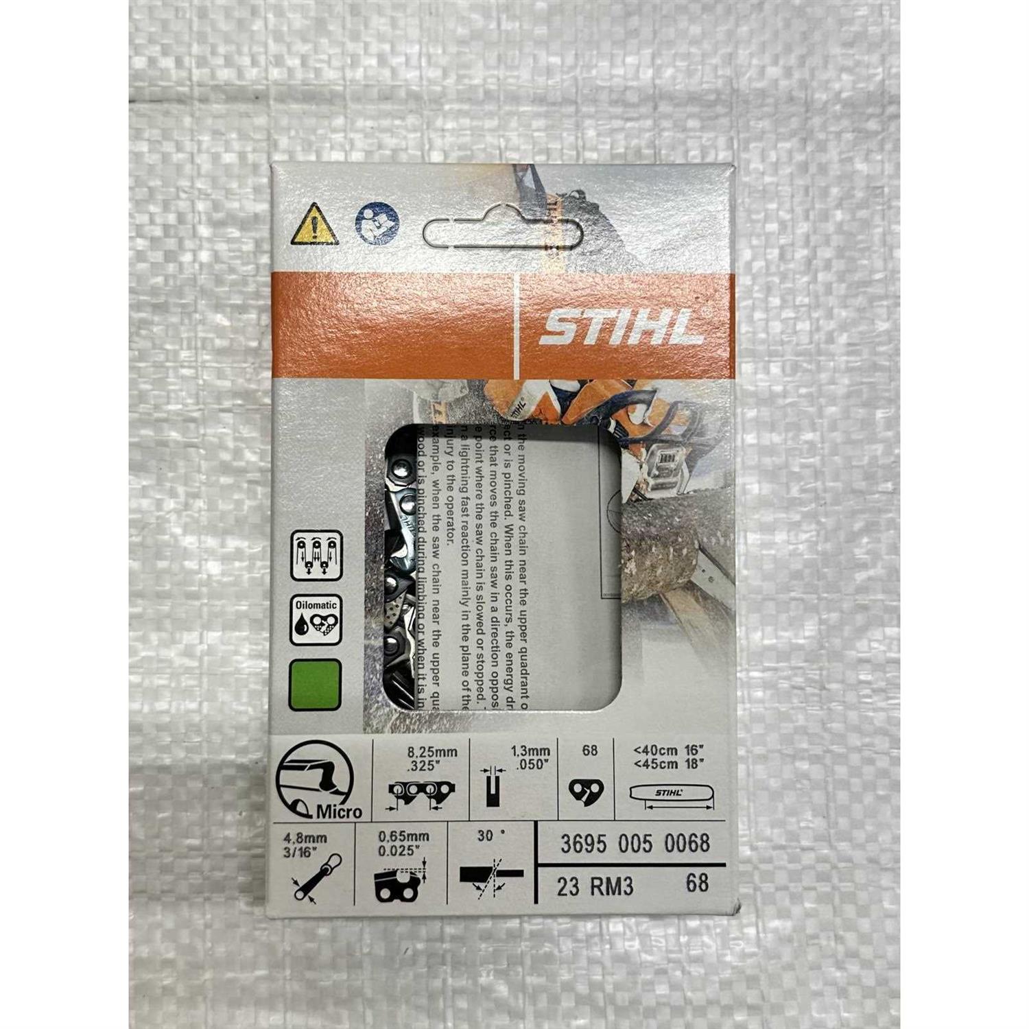 Stihl RAPID Micro 3 is the low kickback version of Stihl RAPID Micro saw chain. RM3 retains all the performance of Stihl RM chain, with the added benefit of low kickback to reduce the risk of kickback injury. It is a taller profile chain with more mass for chainsaws with larger displacement engines. Featuring a semi-chisel type of cutter, it typically does not get dull as fast as a full chisel chain during normal use, making it easier to maintain. The RM3 chain is ideal for felling, bucking and limbing. It is a general-purpose chain for the high demands of full-time professionals in agriculture, construction and the forestry industry. It is also suitable for nonprofessional users working under similar conditions. Stihl recommends using low kickback, green labeled chain and green labeled reduced kickback bars on all powerheads.