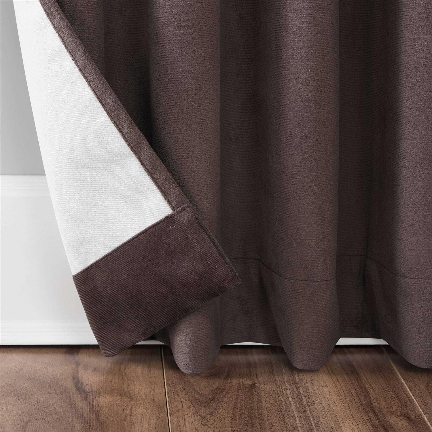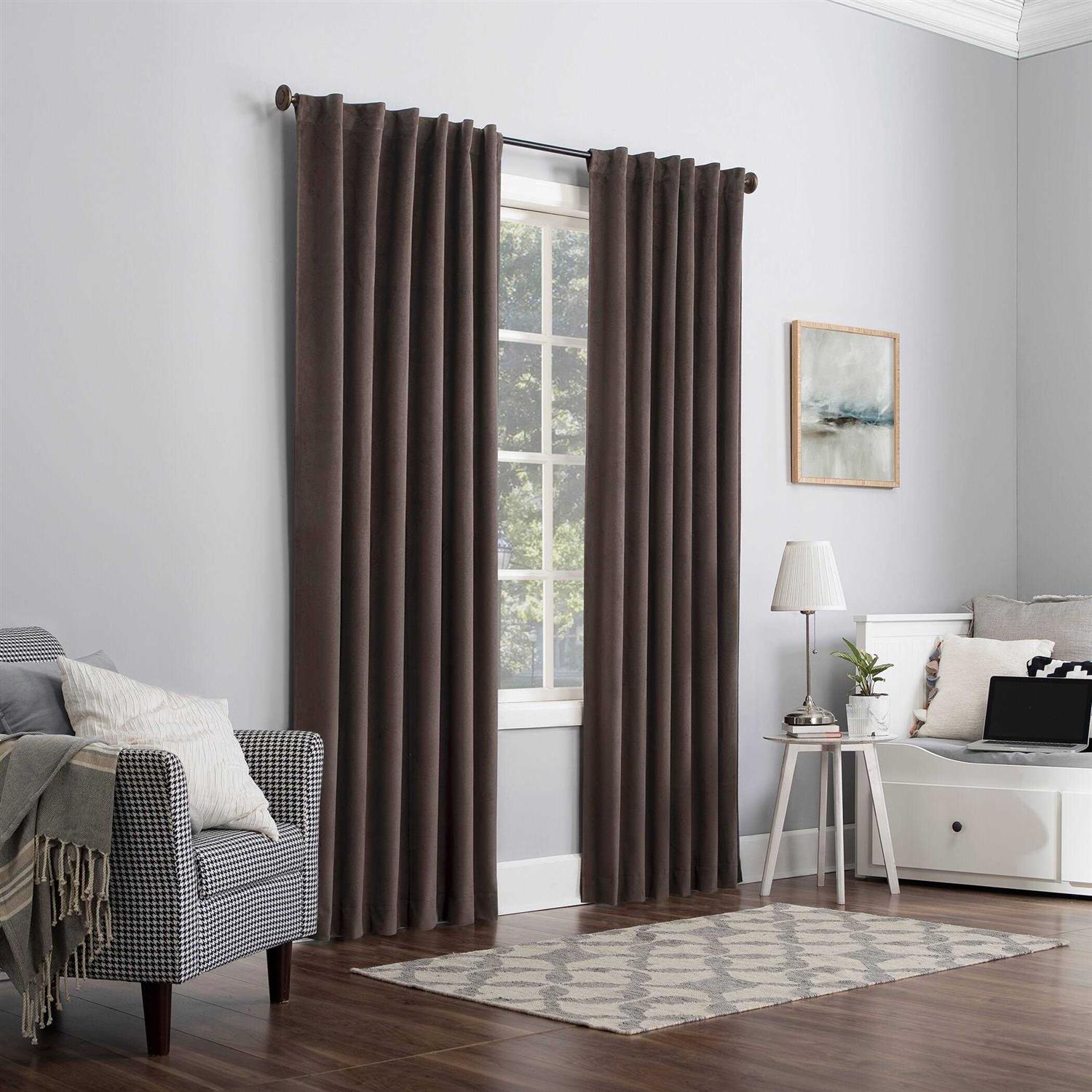 Featuring a decadent velvet fabric, Sun Zero Hampshire Velvet Thermal Extreme 100% Blackout Back Tab Curtain Panels add luxe appeal to any room of your home. Equipped with hidden back tabs for easy hanging on standard curtain rods up to 1. 5 inch in diameter. Sun Zero Extreme Blackout Thermal Lining is laboratory tested to block out 100% of light, reduce outside noise by up to 40%, and decrease energy lost through your windows by up to 40%. Comfort is optimized with thermal properties that help keep summer heat and winter chill out of your home. Hang in your entertainment room to eliminate screen glare and reduce distracting outside noise, or in your bedroom for enhanced privacy and a sounder, more uninterrupted sleep. Sold as individual panels measuring 50 inch width by 96 inch length. Measure carefully before selecting your desired size and quantity. Rod not included. Machine wash cold on gentle cycle. Use non-chlorine bleach when needed. Tumble dry on low heat, using a cool iron as needed.