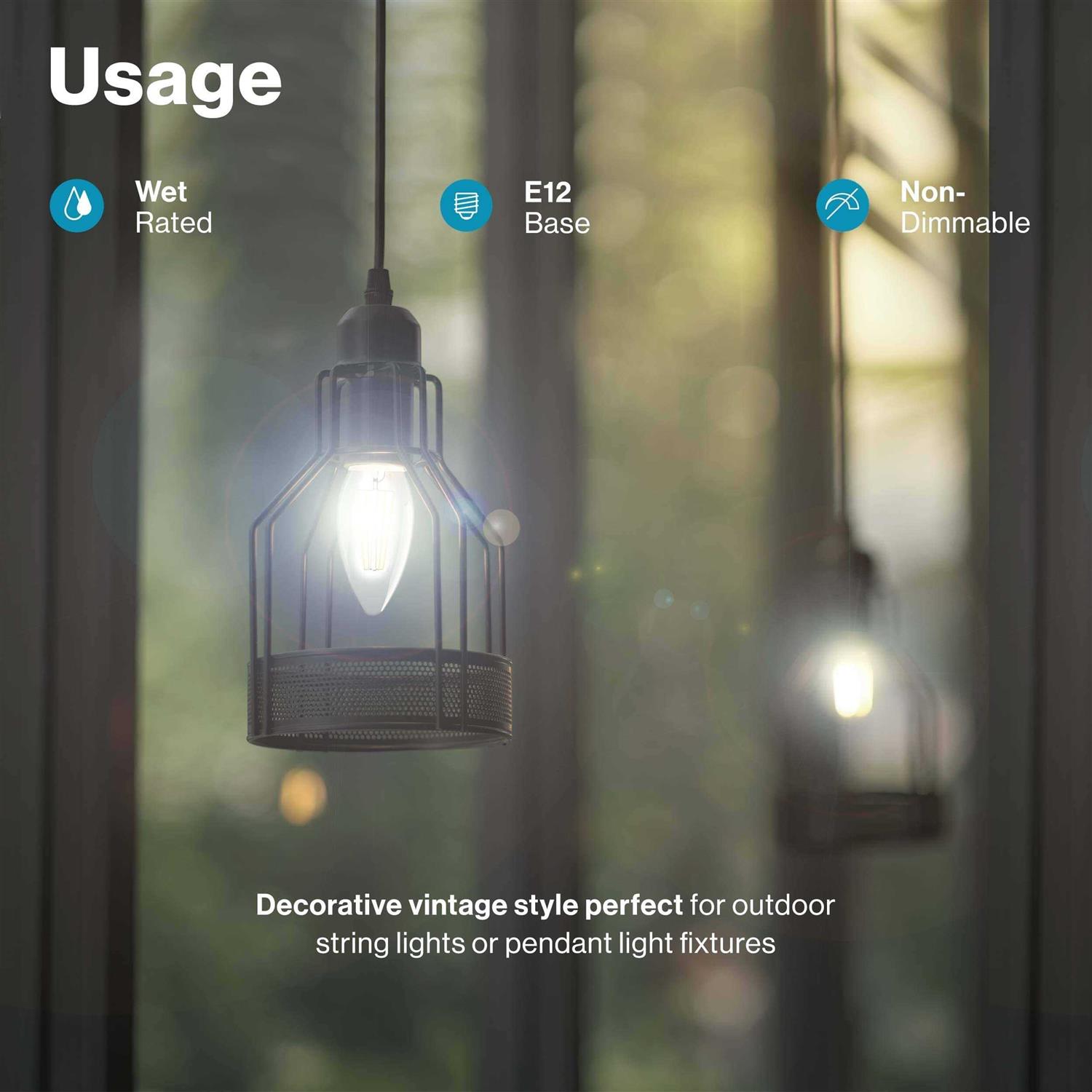 Top Rated Dusk to Dawn B11 LED Filament Candelabra Bulb with E12 Base DUSK TO DAWN – Using the latest technology, Sunco’s B11 LED Dusk to Dawn bulb powers on automatically when the sun goes down. The photocell sensor detects light levels to act as an automatic night light. To activate the sensor: turn it on, leave it on. VERSATILITY – No need to worry about accidentally leaving the lights on and won’t leave you bumping into things to find the switch. Lower your energy consumption (up to 85%) by converting to LED. Our LED B11 Filament Bulbs are suitable for outdoor applications in enclosed fixtures. These are gorgeous, retro style Edison bulbs for your chandelier, sconce or wall lantern. Our auto on/off B11 LEDs deliver instant start up with no warm up, and no buzzing or flickering for maximum eye comfort. Note: This bulb is non-dimmable.