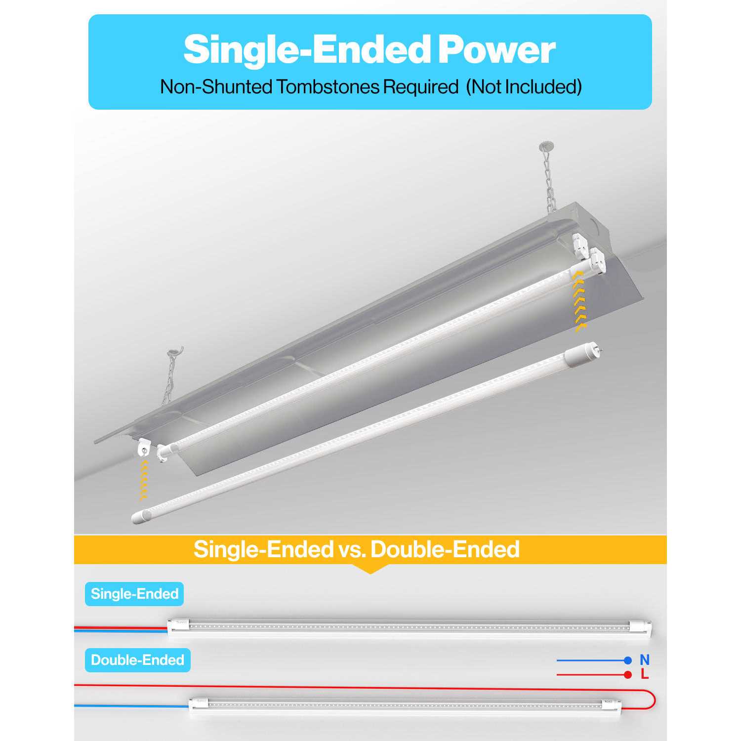 Top Rated T8 LED Tube Single Sided Ballast Bypass Type B with G13 Base SINGLE ENDED POWER (SEP)- Use with non-shunted tombstones (not included) to convert existing fixtures to LED for instant energy savings (up to 85%). Sunco LED tubes help you avoid costly ballast replacement and provide instant bright light with no flickering. Certifications: UL, FCC, RoHS. Specifications: Length 4ft (48″), 120-277V, 160° Beam Angle, Instant Start, 50,000 hour Lifetime. EASY INSTALL – Follow our installation guide for a quick and easy setup. Rewire your fixture to disconnect and remove or bypass the existing ballast, then connect live and neutral wires from the power source to corresponding socket wiring. Requires non-shunted tombstones (not included).