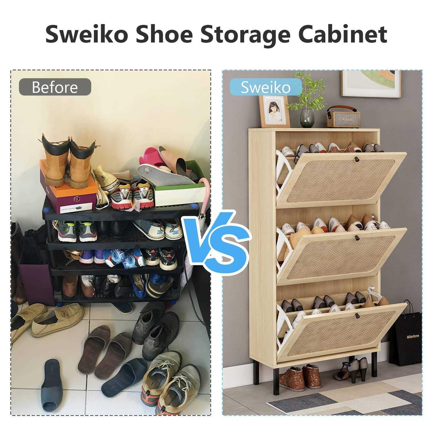 SPACIOUS FLIP DRAWERS: The shoe cabinet contains 3 flip drawers, each drawer has 2 compartments.Support MEN SIZE within 8.5 and WOMEN SIZE within 10. REMOVABLE SHELF: The middle shelf can be adjusted to place different style of shoes. The shoe storage cabinet can hold up to 18 pairs of home shoes if placed normally. NATURAL RATTAN CABINET: Adopt natural rattan skin to make the facade, environmental protection, natural, breathable. Four separate, frosted metal bases provide excellent stability. EXTRA STORAGE SPACE: Free table top provides a place for photo frames, hats and bags. The blank area at the bottom can store daily household shoes and slippers. SAPCE SAVER: Measuring 9.26 inches, it is perfect for narrow spaces such as entryway and hallway. Flip doors keep your shoes away from dust by not exposing them directly to the air. br br Natural Rattan Shoe Storage Cabinet With 3 Adjustable Flip Drawers /b br br The narrow shoe cabinet comes with three drawers, each with removable shelves to accommodate different styles of shoes. Remove the shelves to accommodate high tops like boots. The door is made of natural rattan, which has strong air permeability and refreshing feel, bringing you a natural breath full of vitality. br For easy opening and closing, each drawer comes with a textured black handle. The back of the cabinet is enclosed to protect your white walls from getting dirty. The bottom has 4 metal bases to provide excellent stability. Each foot is fitted with pads to prevent scratches on the floor. Sweiko shoe cabinet can be very good to hide shoes, so that your living room, study, porch always keep clean and tidy. br br br Specifications: /b br Product Size: L26.63 x W9.45 x H48.23 Inch br Packing Size: L46.3 x W25.24 x H4.77 Inch br Material:MDF Boards, Natural Rattan br Color: Natural br G.W.: 48.05 lbs br N.W.: 41 lbs br Pc/Ctn: 1 Pc br br Package contains: /b br 1 x Accessories Bag br 1 x Shoe Cabinet br 1 x Instruction