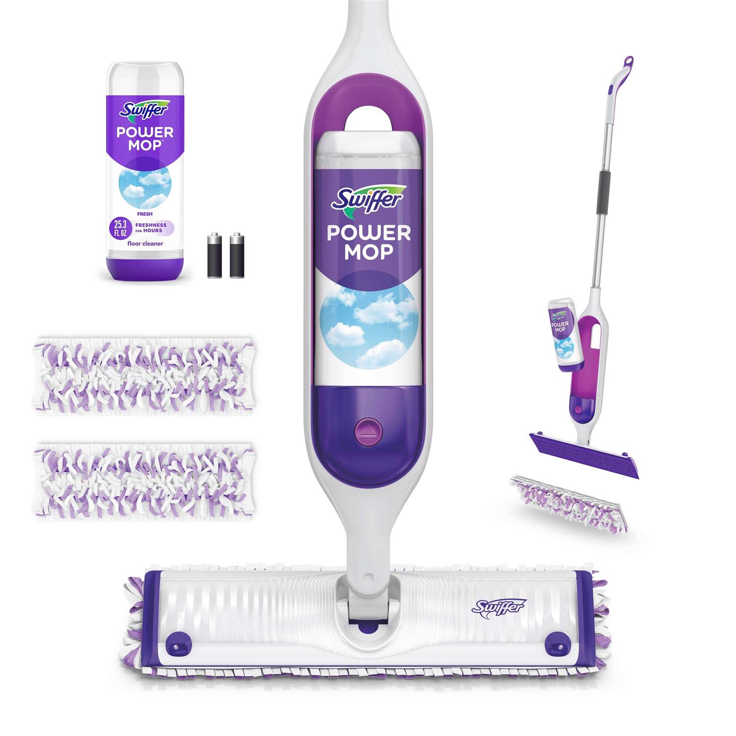 Mop smarter with the Swiffer PowerMop, an all-in-one mopping system that gives you a mop and bucket clean in half the time. The multi-surface mopping pads have 300+ scrubbing strips that reach deep into grooves and grout to remove sticky spills and daily dirt and grime. The fresh scent of PowerMop solution will fill your home with freshness for hours.