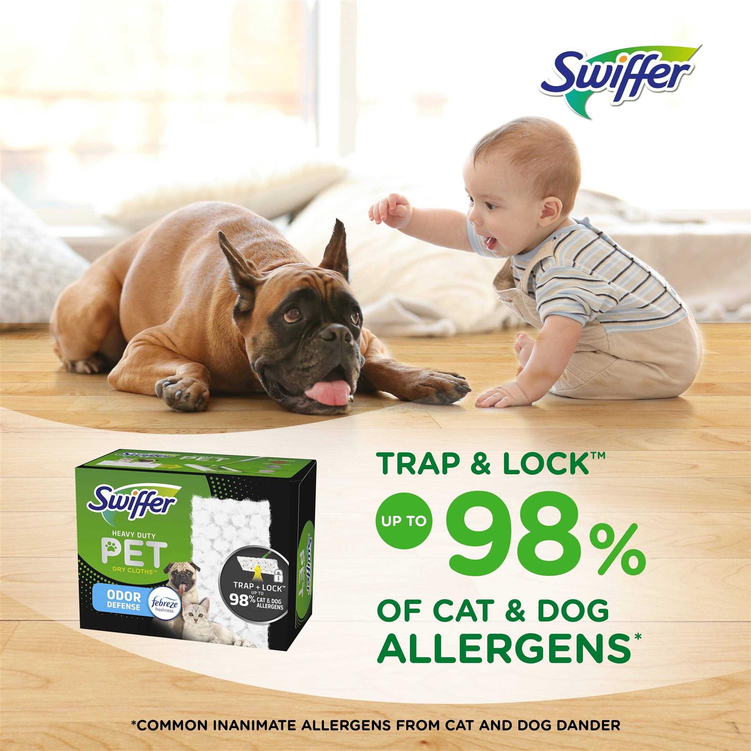 Swiffer sweeper pet dry sweeping cloth refills with Febreze freshness have deep textured ridges that trap + lock dirt, dust, hair & allergens to keep your floors clean and free of debris. Use with Swiffer sweeper and Swiffer Sweep+Vac. Common inanimate allergens from cat and dog dander & dust mite matter.
