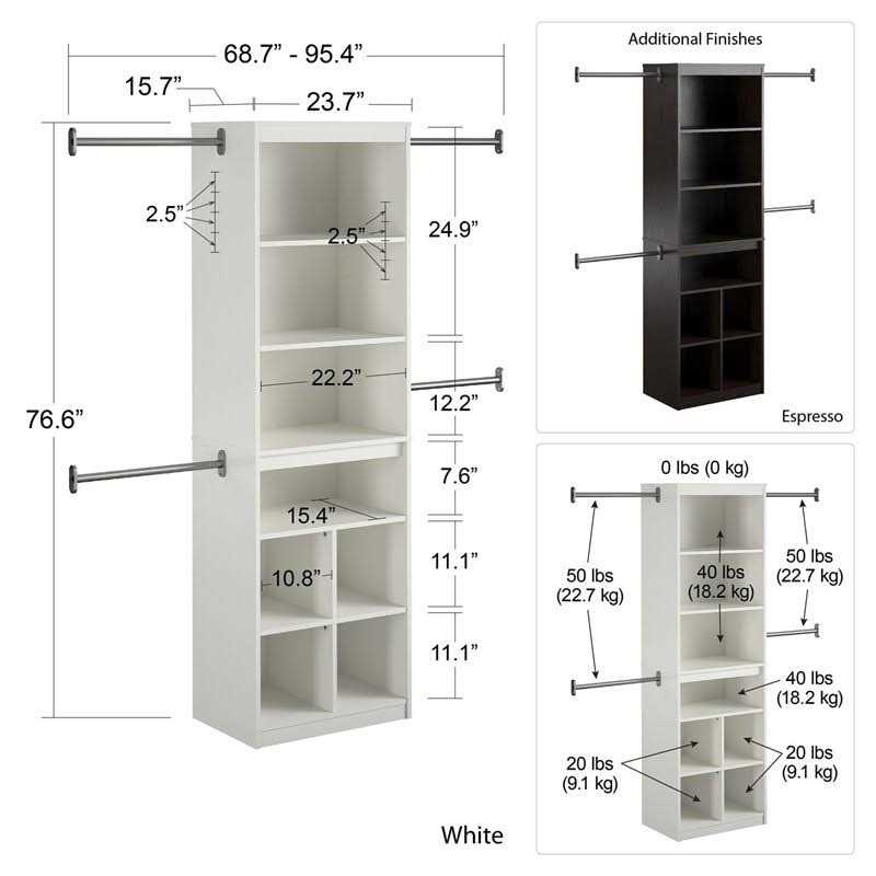 - Simple, yet sleek look of this system brings just enough storage with 4-adjustable clothing rods, 4-shelves (1-adjustable) and 4-shoe cubbies