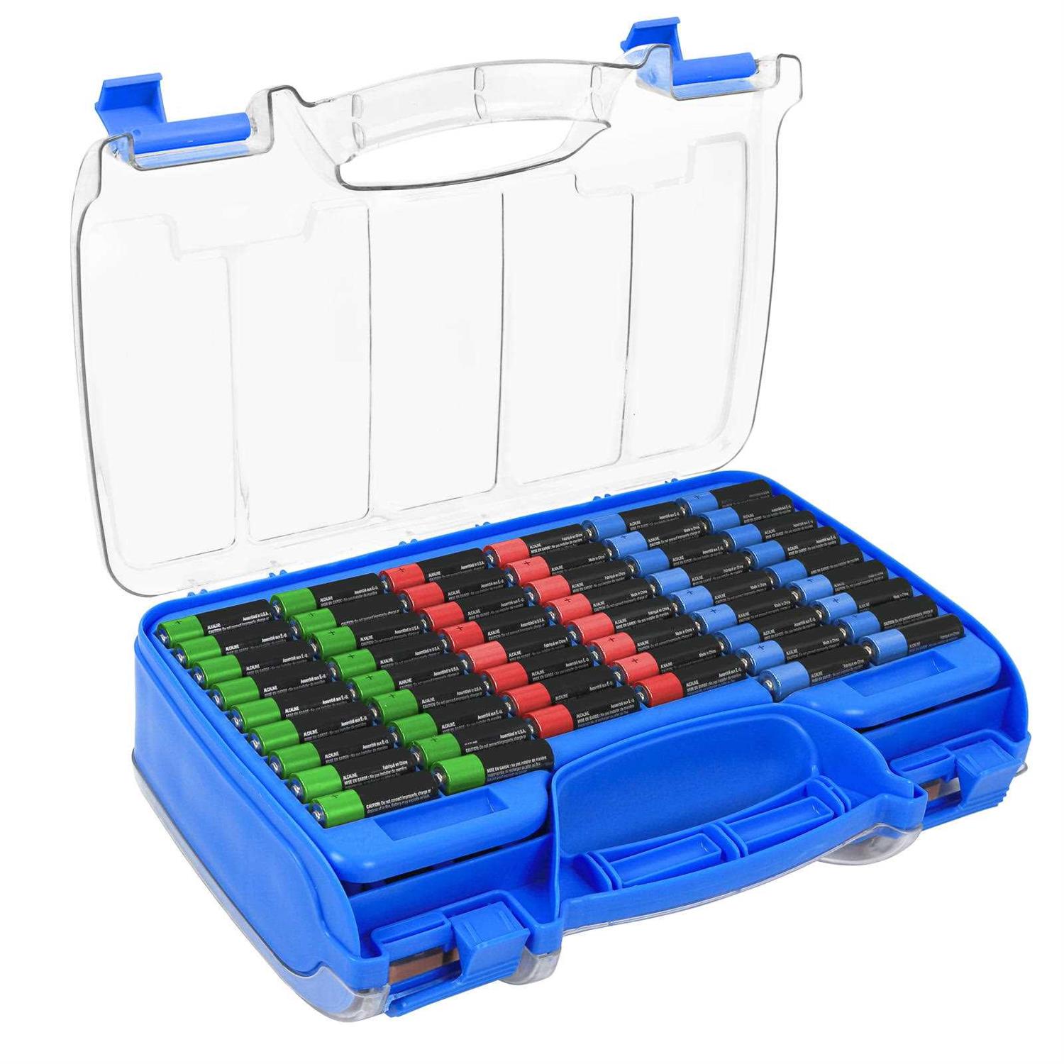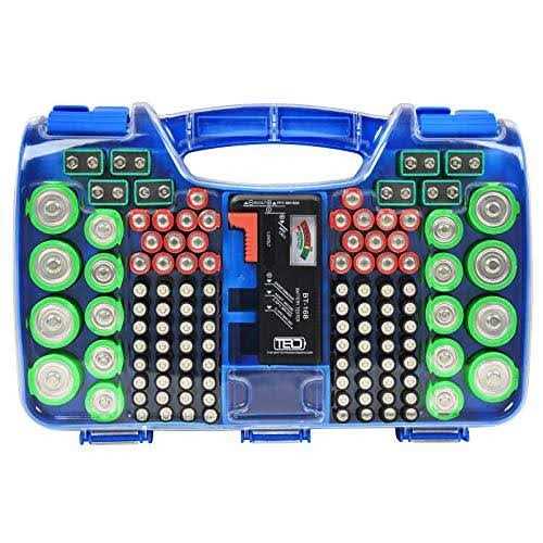 The Battery Organizer Storage Case with Hinged Clear Cover, Includes A Removable Battery Tester, Holds 180 Batteries Various Sizes Blue.