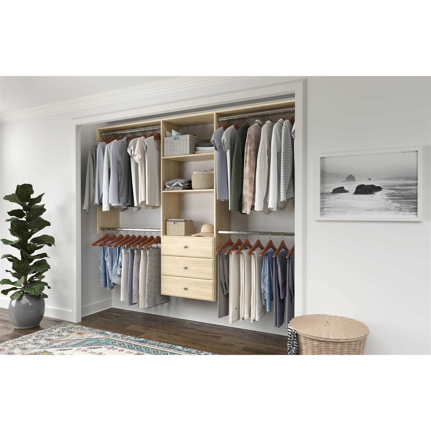 Organizing your closet will be easy with the Closet Evolution Essential Plus Closet Kit. This kit provides up to 12 ft. of hanging space and 16 ft. of shelf space. Closet Evolution Closet kits can be used individually or combined for larger closet needs. Featuring a Harvest Grain finish that will keep any space looking beautiful and timeless.