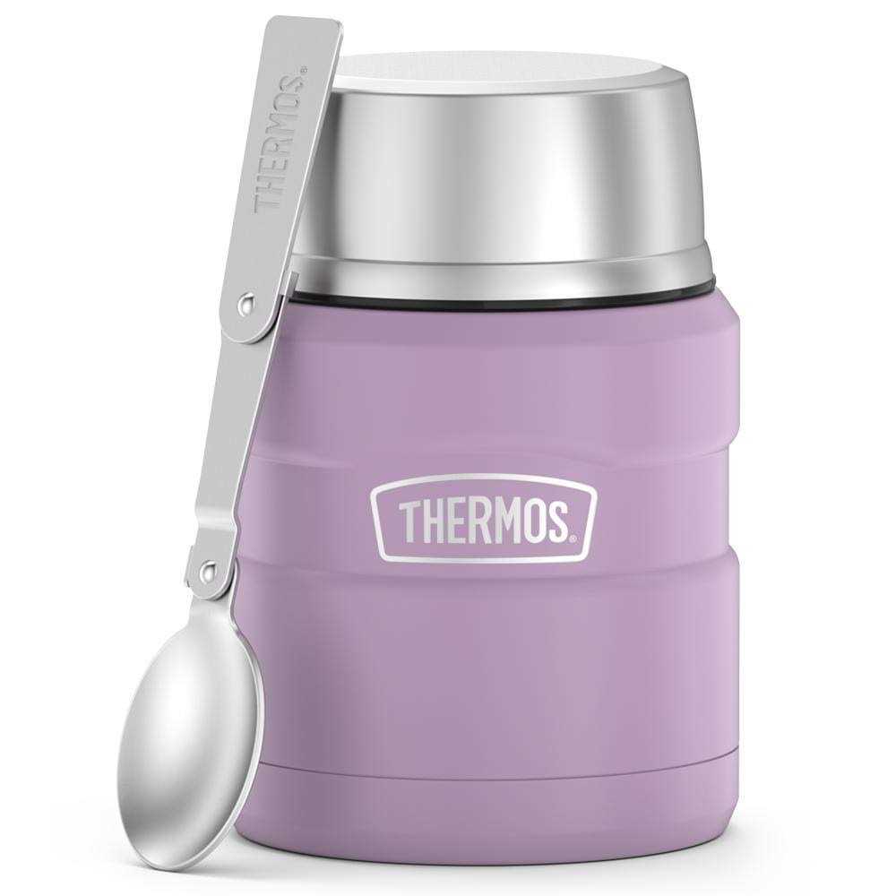 The Stainless King 16-ounce Stainless Steel Food Jar rules for taking the food you love anywhere. Keep fresh fruit and vegetables cool for up to 14 hours while you take on the day. For your favorite hot soups or oatmeal, every sip stays piping hot for up to 9 hours. Your options are endless. Count on Thermos vacuum insulation to keep weather out and the delicious in. It’s easy to fill, easy to clean and comes crowned with a built-in serving bowl lid. As a bonus, you get a full-sized folding stainless steel spoon that fits right into the lid.Thermos makes high performance and durable food jars fit for a king – or queen. Constructed with double wall stainless steel, this insulated food jar is durable and designed to have a contoured shape that’s easy to grip.