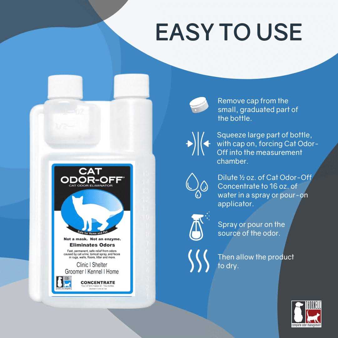 - Eliminates odors from tom cat spray, urine and feces in litter, rugs and upholstery
