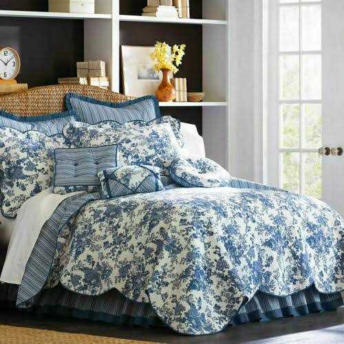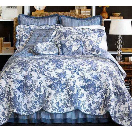 The popularity of toile dates back to the 1700s. Floral toile print reverses to stripes Scalloped edge with contrast binding All-over vermicelli quilting quilt is 88″ x 90″ Cotton Washable Imported Euro shams, pillow shams, bedskirt, accent pillows and window coverings sold separately. Please make ONE combined payment for multiple item purchases.