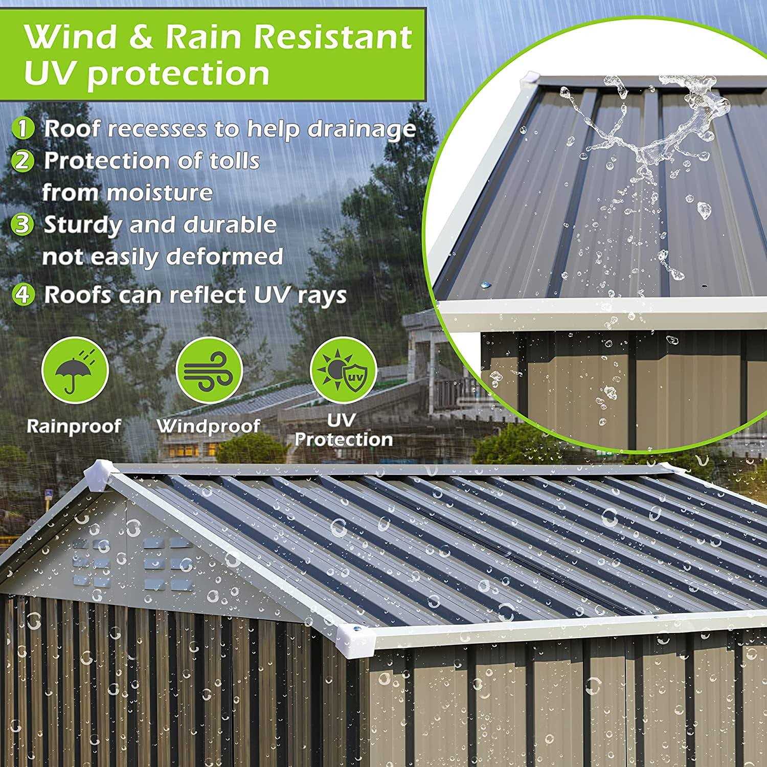 This Tolead 6′ x 4′ garden storage shed is an ideal storage solution for small gardens or areas with limited space. Durable construction with galvanized steel reinforcement makes this storage shed rustproof and UV-resistant. And the metal floor frame makes this shed more sturdy and durable. The inclined slope roof adds extra storage and prevents rainwater from gathering and preventing rust. The lockable door grants extra safety. This outdoor storage shed has the perfect size for storing bicycles, lawnmowers, barbeques, and garden tools. Perfect for your garden, backyard, lawn, and any outdoor space you want. garden shed has a sloped roof that adds extra storage space(30 sq ft) while preventing rainwater from accumulating and rusting. In addition, 12 vents with punched holes can maintain ventilation and prevent insufficient air inside. Metal locking system with key makes it a more secure storage shed. Plastic corner guards are installed on the roof to prevent head injuries.
