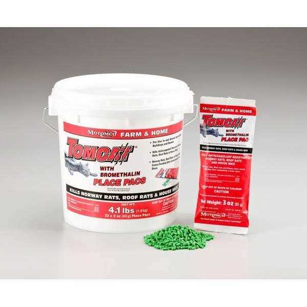 Tomcat with Bromethalin Place Pacs contain the premium active ingredient Bromethalin, excellent for proven control of high rodent populations and severe infestations. Bromethalin is an acute, non-anticoagulant active that will begin to kill rats & mice in 2 or more days, faster than anticoagulant baits. Due to a quick knockdown when compared to anticoagulants, more rodents can be controlled with less bait. Pellets are packaged in individual, pre-measured 3 oz Place Pacs, which protect the bait and make it easier to get into tight spaces or hard to reach locations. Place Pacs are excellent for knockdown of rodent populations or severe infestations. Proven combination of palatability and effective control. Kills by affecting the rodents’ nervous system – Bromethalin is an ATP Inhibitor, which prevents the transfer of energy across nerve cells. Place Pacs kill rats and mice in 2 or more days after consuming a lethal dose. Excellent rodent control for tight spaces and hard to reach areas. Place Pacs keep bait fresh and protect the pellets from dirt, dust and moisture. Rodents will cease feeding cease feeding after consuming a lethal dose, requiring less bait to be used compared with other anticoagulant baits.