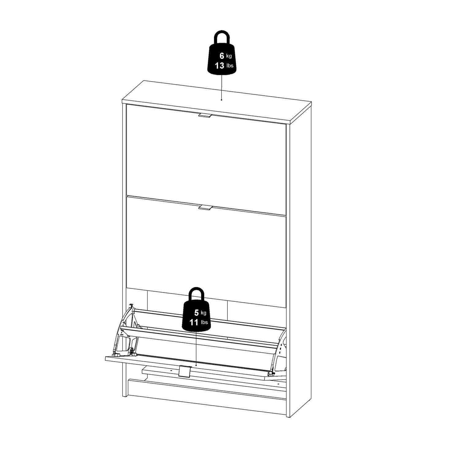 Organize all your footwear in one place and create a clutter-free space with the Bright 3 drawer shoe cabinet. With room for two rows of shoes in each compartment, the shoe cabinet will protect about 18 pairs of your footwear, keeping them looking new. The tilting drawers ensure quick and easy access to your shoes when rushing out the door. This Scandinavian design has a foil surface that is easy to clean and less susceptible to scoring while providing a durable and functional storage piece that looks anything but utilitarian. Combine with other pieces from the Bright collection to build a shoe cabinet unit.