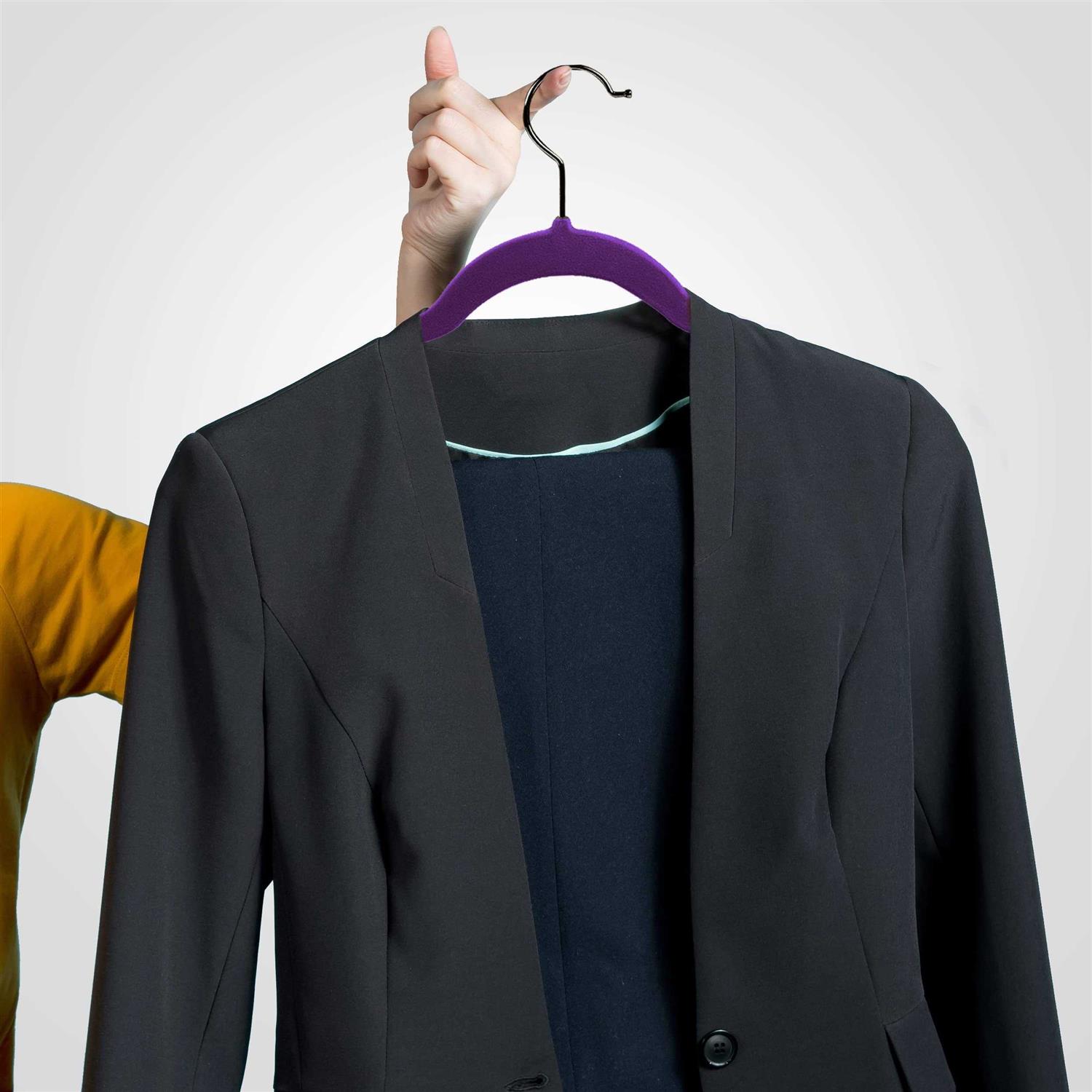 VELVET CLOTHES HANGER – Set of elegant velvet hangers, each measuring 17. 5 x 0.24 x 9.06 inches. Made from sturdy ABS material that is strong enough to hold 10 pounds. SLIM DESIGN – These stylish 360-degree rotating velvet hangers add sophistication to your wardrobe, and the slim design ensures a neat and minimalist look. STURDY HOOK – The strong and elegant metallic hook has a refined chrome finish that enhances your wardrobe embellishment. SPACE SAVING – Our sleek and stylish velvet hangers help you maximize space so you no longer have to deal with a cluttered look. NON-SLIP SURFACE – The velvet-coated surface of the hangers prevents your suits, pants and delicate blouses from falling and offers you wrinkle-free attire for your day-to-day fashion statement.