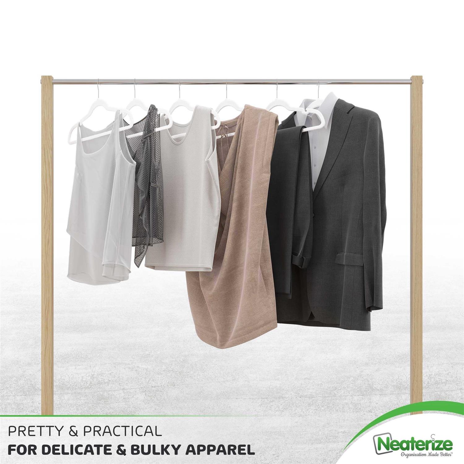 USE, REUSE, REPEAT! Built to battle the chaos closets can become, Neaterize hangers provide a sophisticated solution to organization while remaining strong & sturdy through the many seasons to come! THE MAGAZINE-WORTHY CLOSET! Neat freak or not, these velvet hangers are the most effective tool for organizing & storing clothing, coats, and accessories. Hang with class and convenience! EXCLUSIVELY DESIGNED NOTCH! Unique to Neaterize velvet hangers is the added notch allowing accessories to remain with their counterparts to ensure easy removal. Keep that belt/tie/ribbon/top right where they belong!