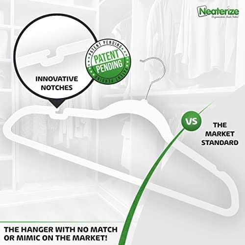 USE, REUSE, REPEAT! Built to battle the chaos closets can become, Neaterize hangers provide a sophisticated solution to organization while remaining strong & sturdy through the many seasons to come! THE MAGAZINE-WORTHY CLOSET! Neat freak or not, these velvet hangers are the most effective tool for organizing & storing clothing, coats, and accessories. Hang with class and convenience! EXCLUSIVELY DESIGNED NOTCH! Unique to Neaterize velvet hangers is the added notch allowing accessories to remain with their counterparts to ensure easy removal. Keep that belt/tie/ribbon/top right where they belong!