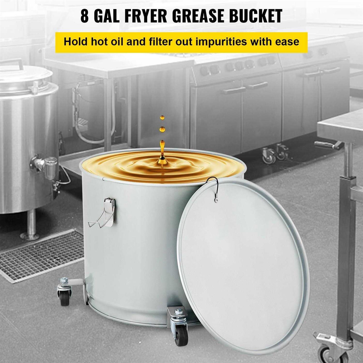 The VEVOR fryer grease bucket enjoys an extensive 8 Gal. capacity, ideal for various catering places. Made of all-over coated carbon steel, it can surely ensure long-time use. 3 lock clips, a sealing ring and gaskets are integrated for effective airtightness. Elastic handles and a detachable caster base make moving or pouring more convenient. An additional filter bag is also provided. Rest assured to store and reuse your frying oil with our oil caddy.
