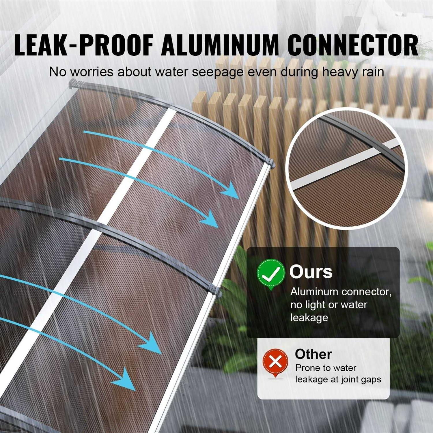 About This Item UPF 50+ Sun Protection: Unlike most awnings, this window awning door canopy offers UPF 50+ sun protection, effectively blocking sunlight and UV rays during the summer while remaining unaffected by rain. It provides a sheltered outdoor space for you and your family throughout the year. Easy Installation: With detailed and clear instructional images, our window awning canopy saves you time and effort during the installation process. Whether it’s freezing winters or scorching summers, it can handle it all. With a sleek appearance and lightweight material, it is suitable for both residential and commercial use. Its versatile colors and design make it compatible with any home or outdoor decor. Seamless Joint Design: This awning features an upgraded assembly design with tightly sealed aluminum joints. Each joint ensures sufficient sealing, preventing water from seeping through even during heavy rain. You can enjoy the rain scenery without getting wet. High-Quality Assurance: This canopy is made of transparent PC panels, ABS brackets, and aluminum alloy installation bars. The PC panels offer excellent transparency, temperature resistance, and durability. The high-strength ABS brackets remain intact without deformation. The aluminum alloy installation bars ensure a secure and watertight installation, withstanding strong winds and storms, providing long-lasting quality protection for your windows and doors. Package Content 2 x Transparent PC Sheet 2 x ABS Black Bracket 3 x Silver Connector 4 x M10 x 80 Expansion Screw 4 x M4 x 20 Self Tapping Screw 2 x Positioning Sticker