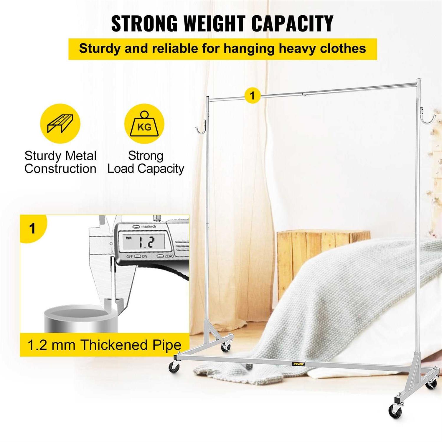 VEVOR Z Rack Industrial Grade Z Base Garment Rack Height Adjustable Rolling Z Rack SYZ6016016011W0UIV0 840281525928 Z Base Garment Rack This rolling garment rack is made of heavy-duty steel strong enough to hold your heavy clothes while 1.2 mm thickened pipe gives extra sturdiness. The portable clothes rack can be easily moved with four swivel casters and two lockable casters provide added stability. Moreover the rolling clothes rack is high enough for your long-style suits. It can al…