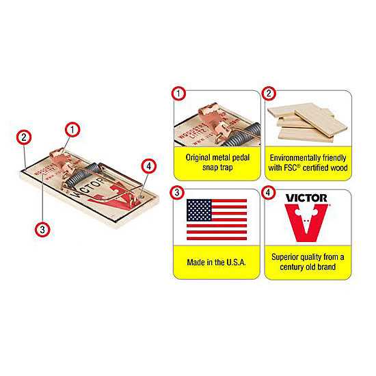 The original wood-based wire snap trap, the Victor Metal Pedal Mouse Trap provides instant rodent control and is safe for household use. Trusted to control mice for over 100 years, this trap allows for clean and quick trapping – ideal for maximum rodent control. Once a rodent triggers the metal petal, the trap immediately springs closed to eliminate the pest on contact. It can then be easily disposed of for quick and clean removal. The traps require no chemicals or poisons, so they are an ideal mouse control device for use around food, water, children and pets.