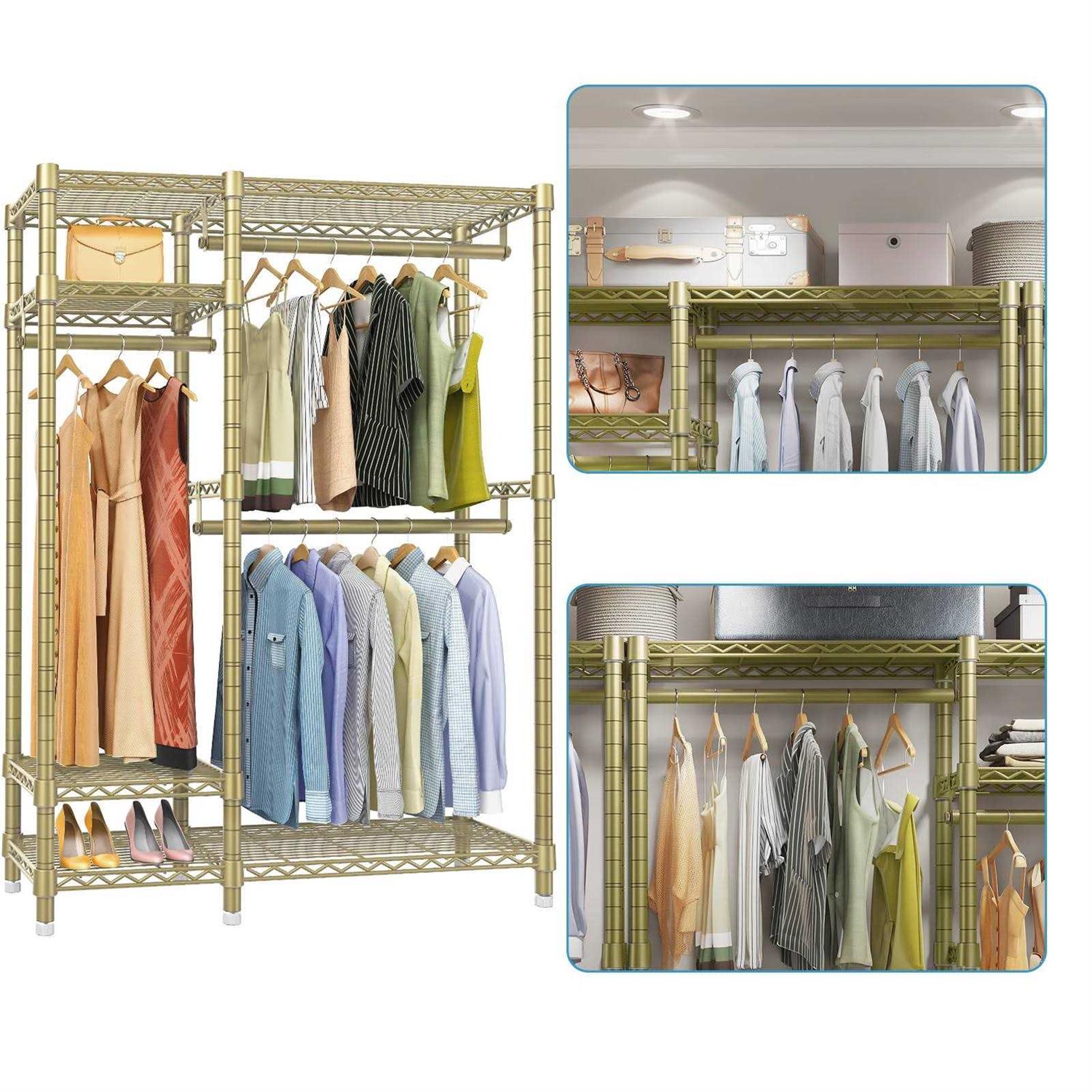 Heavy Duty Clothes Rack with 650lbs Capacity VIPEK V2S features 4 height adjustable shelves for extra storage capacity, you can customize the height of each shelf to make room for items of all sizes; 3 detachable hanging bars that easily accommodates to the length and size of your garments. Color: One Color.