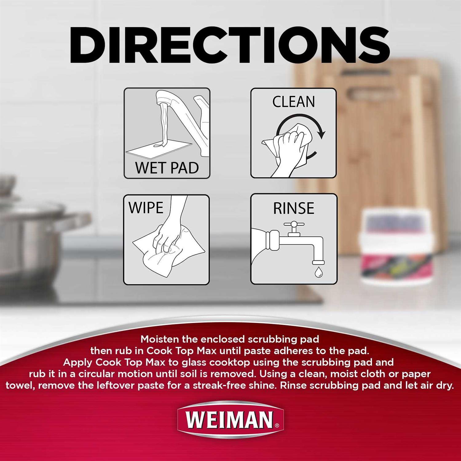 Weiman has been the leading premium surface care expert in homes since 1941. The Cook Top Max is specially formulated with Micro-Bead Technology to easily remove heavily burned on food, grease and water marks from smooth top ranges. The product is guaranteed not to scratch the smooth top range.