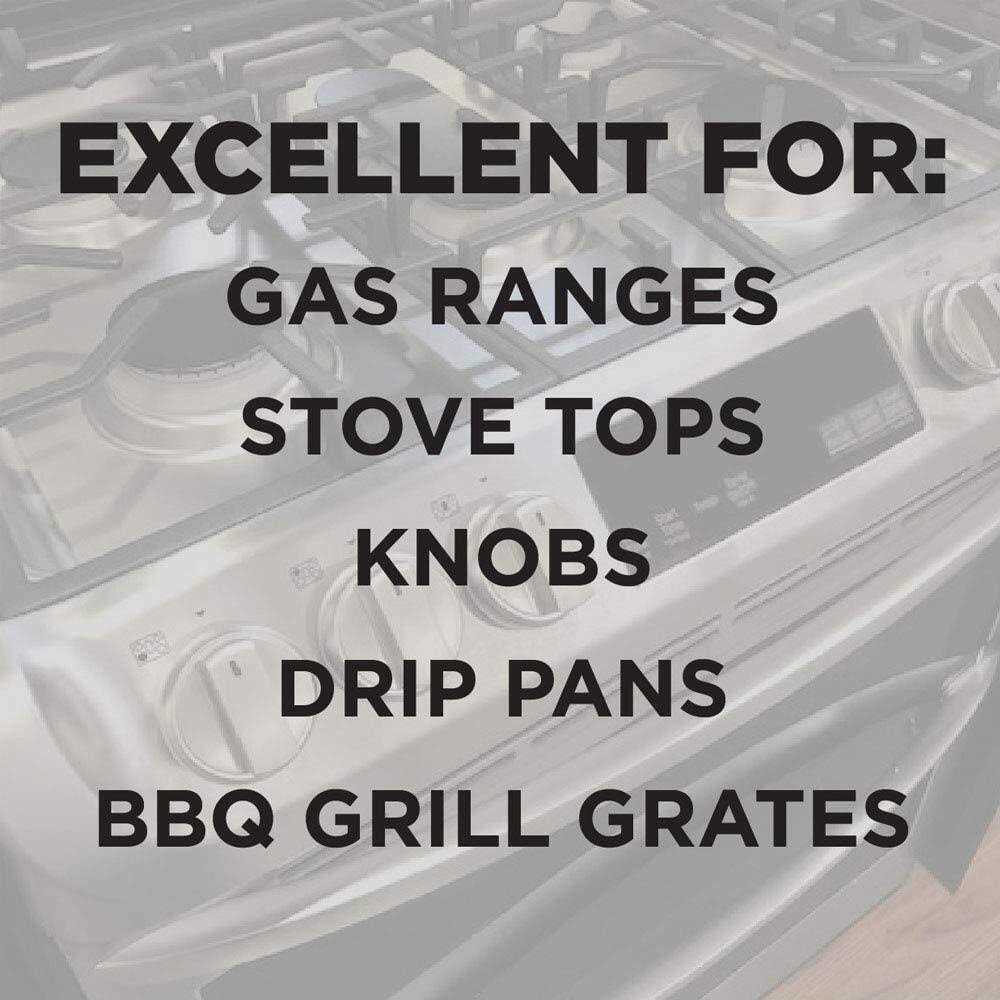 • POWERFUL GAS RANGE CLEANER: Dissolves cooked-on, stubborn soil and gives your gas range a sleek shine