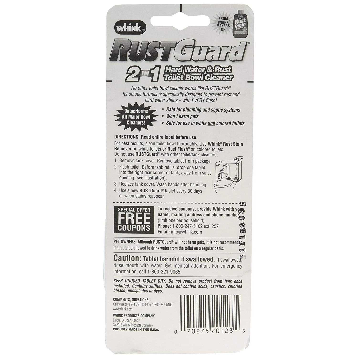 2 in 1 Hard Water and Rust Toilet Bowl Cleaner. Safe for plumbing and septic systems. Stops rust with every flush. Outperforms all major bowl cleaners. No other toilet bowl cleaner works like RUSTGuard. Its unique formula is specifically designed to prevent rust and hard water stains – with every flush. Won’t harm pets. Safe for use in white AND colored toilets. Age Group: adult.