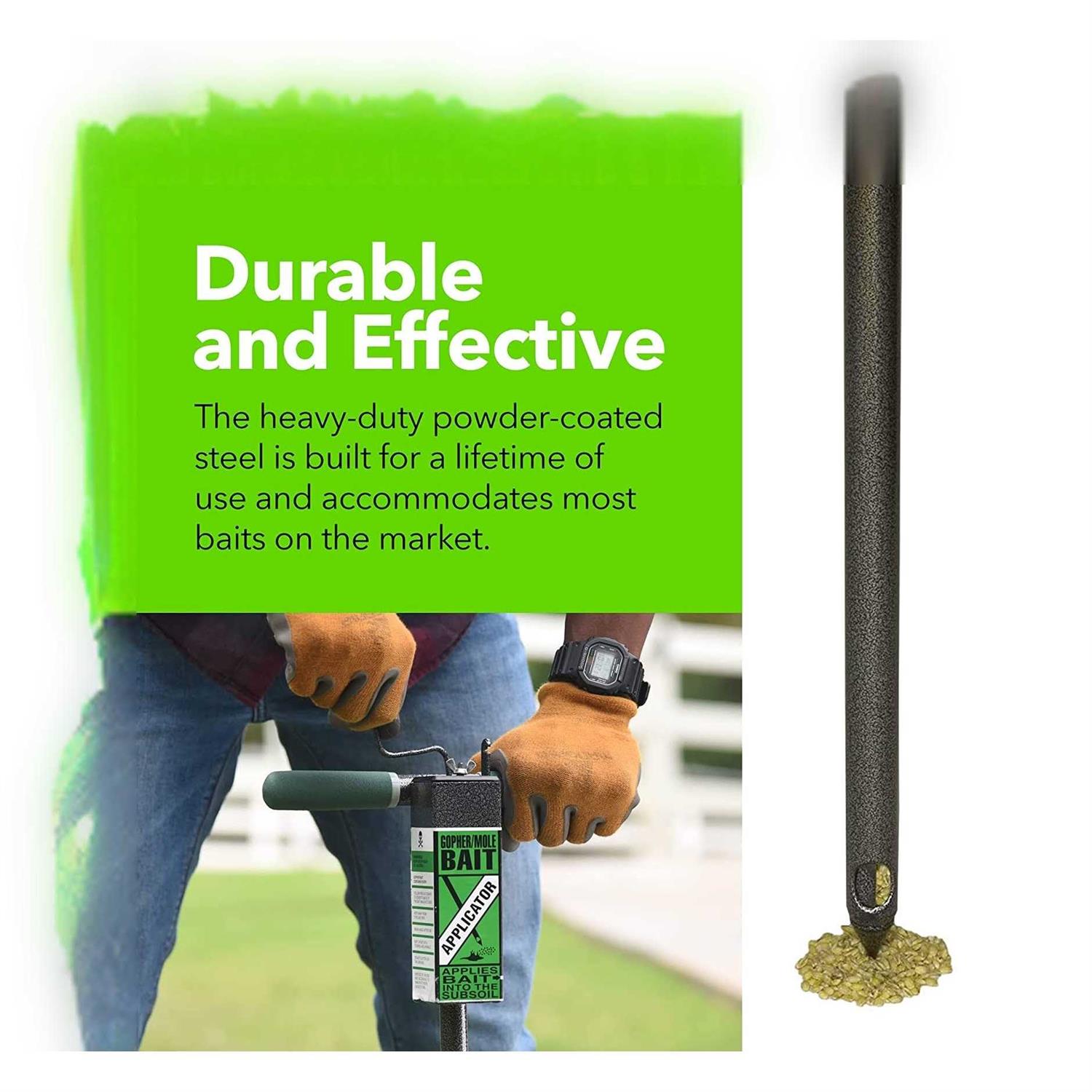 Injects baits directly into rodent runways without having to touch baits or poisons which eliminates human scent to maximize the ability to eliminate rodents. Applicator keeps unsafe baits away from children and pets. Applicator will accommodate all baits and killers on the market. Powder coated to prevent weathering and rust. Made from heavy duty steel. Dimensions: 37″ x 10″ x 3″.