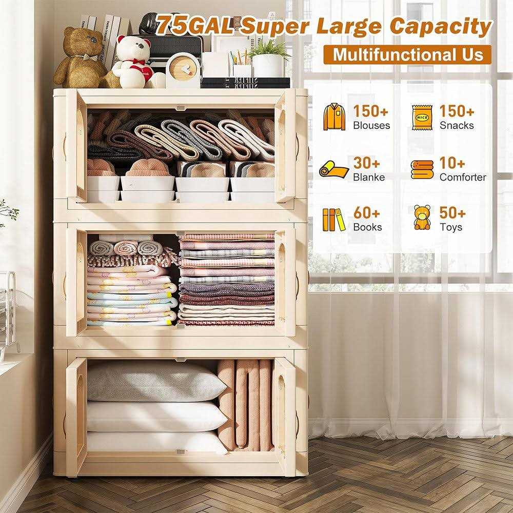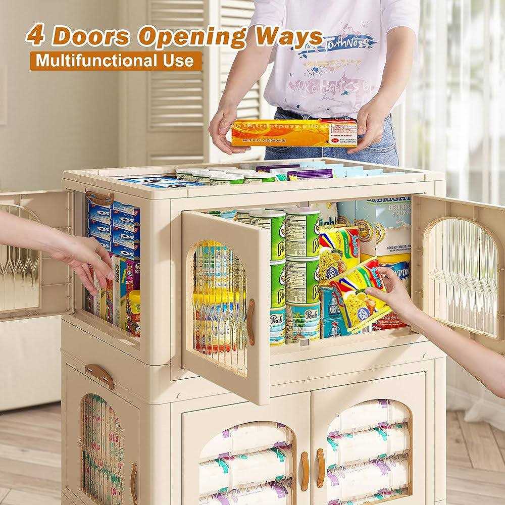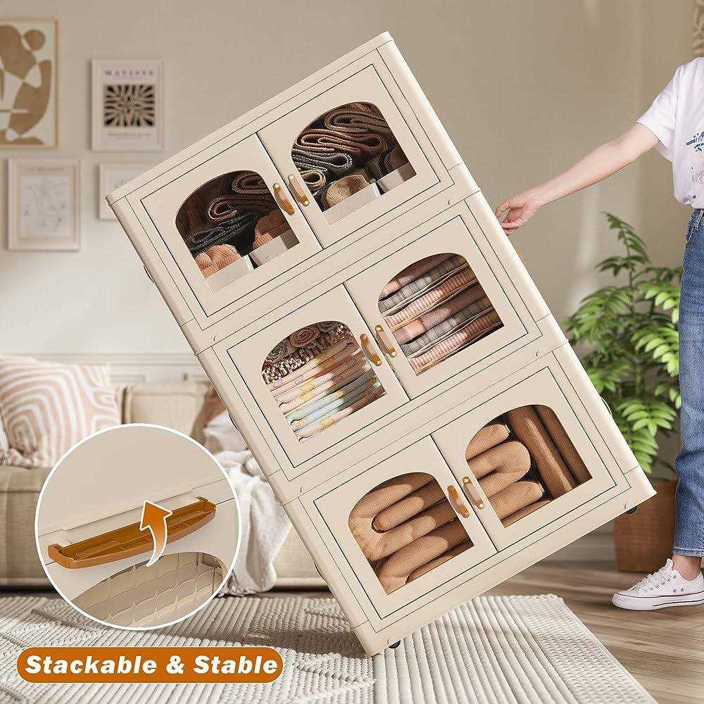 MULTIFUNCTIONAL STORAGE BIN: The installation-free storage organizer is a must-have space saver; This versatile storage cabinet is ideal for bedroom storage, laundry room organization, office supplies, closet organizers, book bins, toy storage, pet food container, outdoor table, etc. FOLDABLE & STACKABLE: 30-second painless setup eliminates the hassle of keeping instructions for assembly; Stackable and collapsible design allows for constant space-saving whether or not it’s in use. STURDY & SPACIOUS: PP+HIPS+PS constructed storage containers are solid enough to hold 88 pounds, with each storage bin featuring a maximum of 8.4 pounds storage capacity. 2-WAY OPENING: Foldable storage containers with a double door-opening design facilitate easy access from the front doors and top lid; The brown door handle features built-in lock buckles that prevent doors from accidentally opening. FUNCTIONAL CONVENIENCE: 2 handles are on both sides of each stackable storage cabinet to enable easy lifting, putting down, and stacking; Our reliable service covers all your concerns.